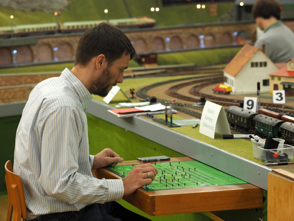 Während sich die Dresdner Parkeisenbahn im Winterschlaf befindet, bilden sich die Parkeisenbahner selbstverständlich weiter. Hierbei geht es nicht nur um graue Theorie. Eine 70m² große Modellbahn in Spur 0 lädt nicht nur zum Staunen, sondern auch zum praktischen Training ein. Im Wechsel mit theoretischer Weiterbildung wird an dieser der Fahrbetrieb durchgeführt. Auf der Anlage steht zwar kein einziger Baum, dafür entsprechen aber Signale und Stellwerke, soweit wie möglich, dem Vorbild.